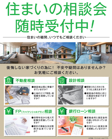 その他、土地のご相談や住宅ローン、FP相談なども随時やっておりますので