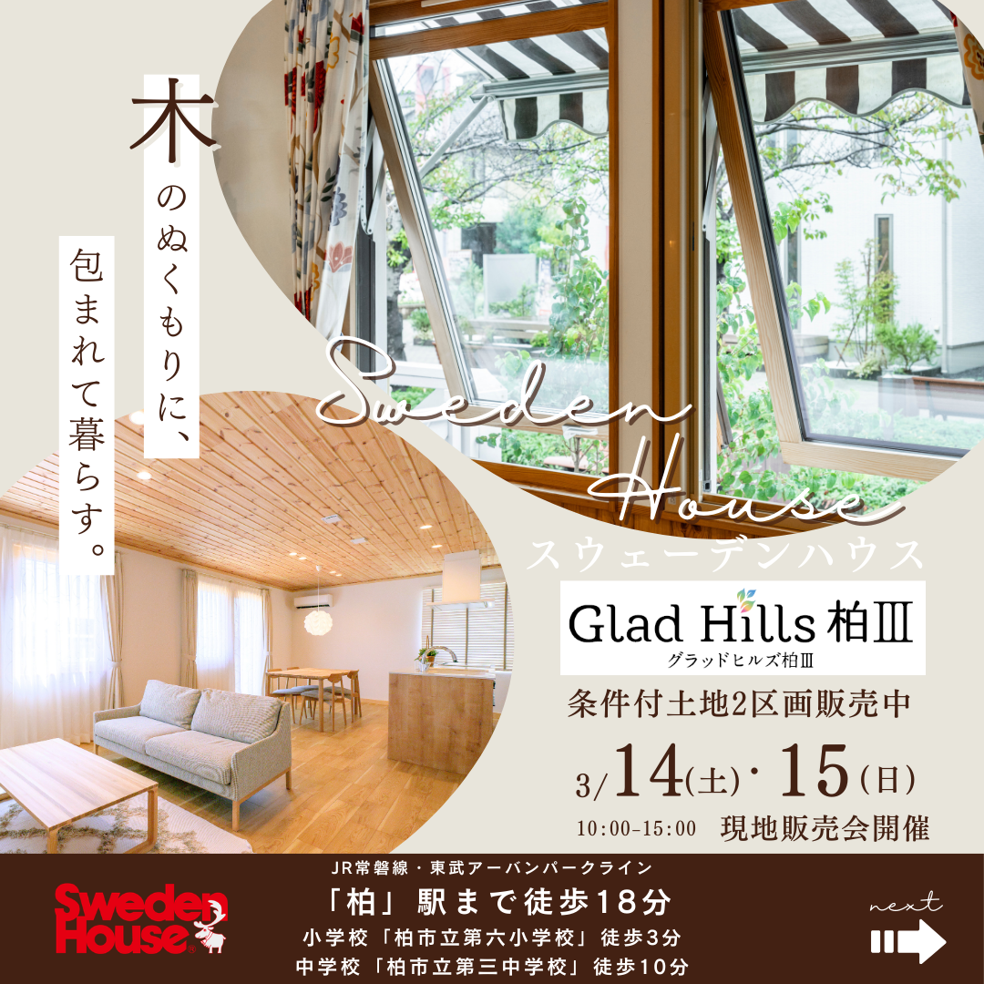 夏は涼しく、冬は暖かくを標準にてご提供しています。大屋根の存在感も可愛らしさだけでなく、圧倒的な基本性能をご体感いただけます。1階は回遊できる間取りとなっており、扉を設けオープンな空間となっています。2階には大屋根の勾配を活かした斜天井は遊び心もあり憧れる方も大勢いらっしゃいます。展示場ではスウェーデンハウスの最大の特徴である「窓」の開け閉めも体験できます。木質感と北欧デザインの調和を楽しめます。(※2015~2026年 オリコン顧客満足度🄬調査 ハウスメーカー 注文住宅 12年連続第1位)