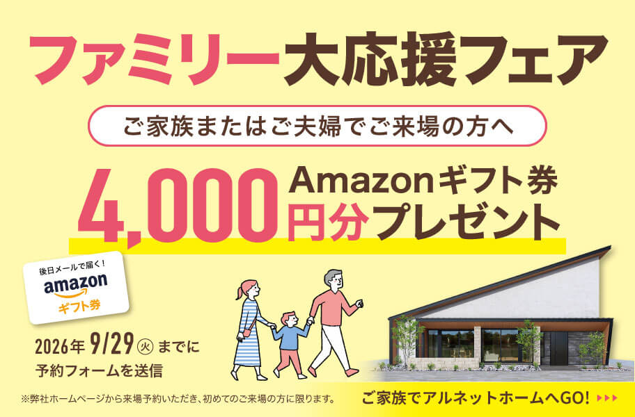 ※Amazonギフト券プレゼントは、アルネットホーム公式ホームページからの予約(下記「来場予約はコチラ」)からご予約いただいた方限定の特典です。総合展示場サイト内の「見学予約」フォームからのご予約は対象外となりますので、あらかじめご了承ください。