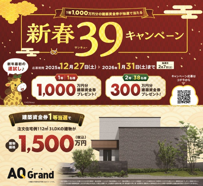 アキュラホームでは、抽選で建築資金券が当たる新春39キャンペーンを開催中です!