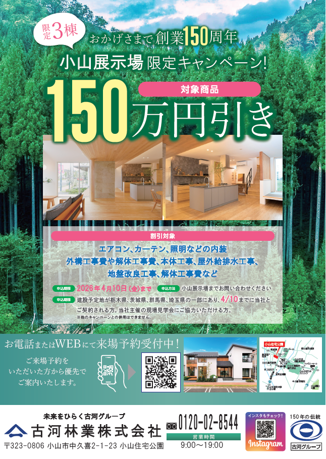 この感謝の想いを忘れずに、小山展示場限定の150周年記念キャンペーンを開催いたします!