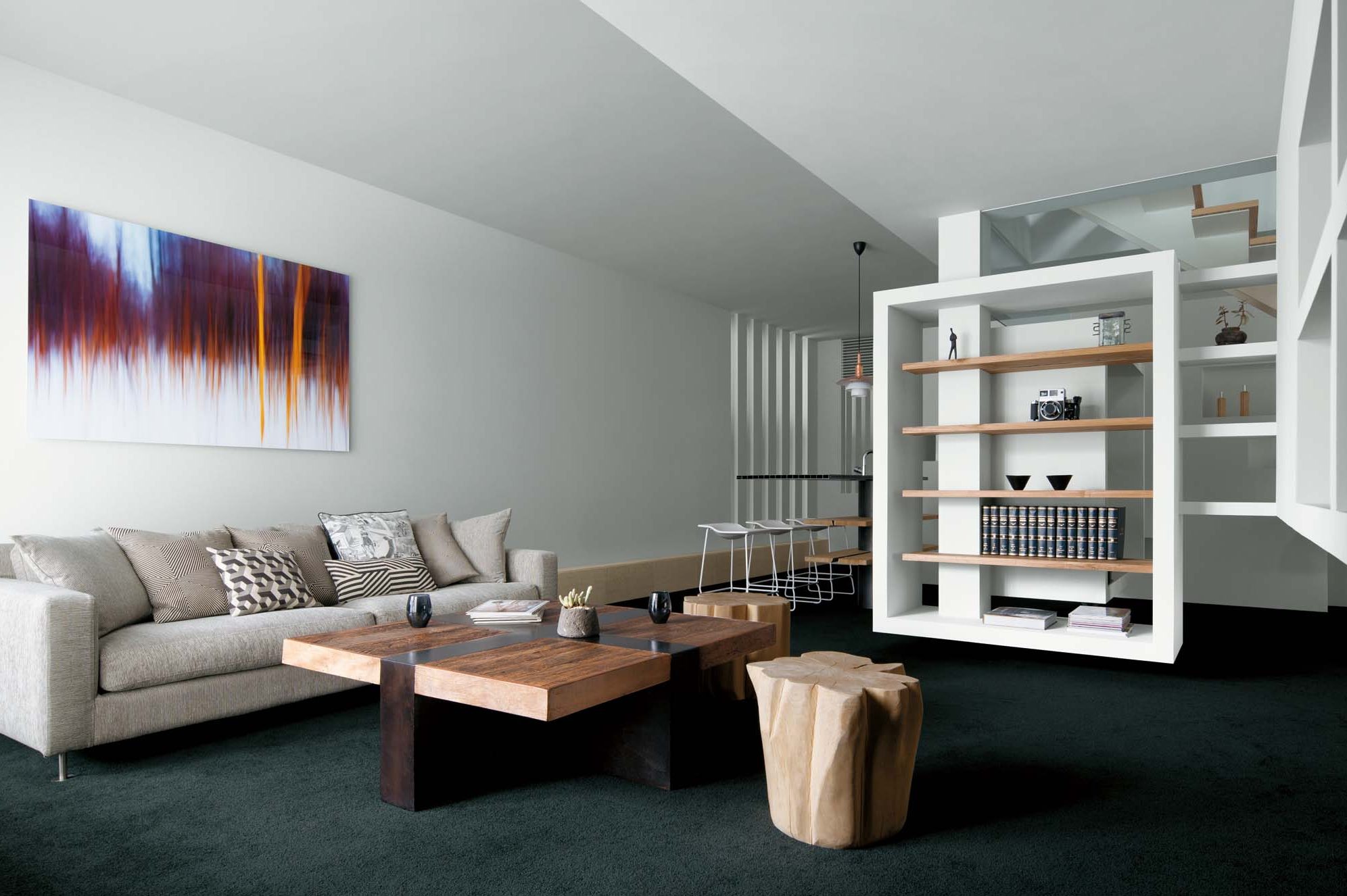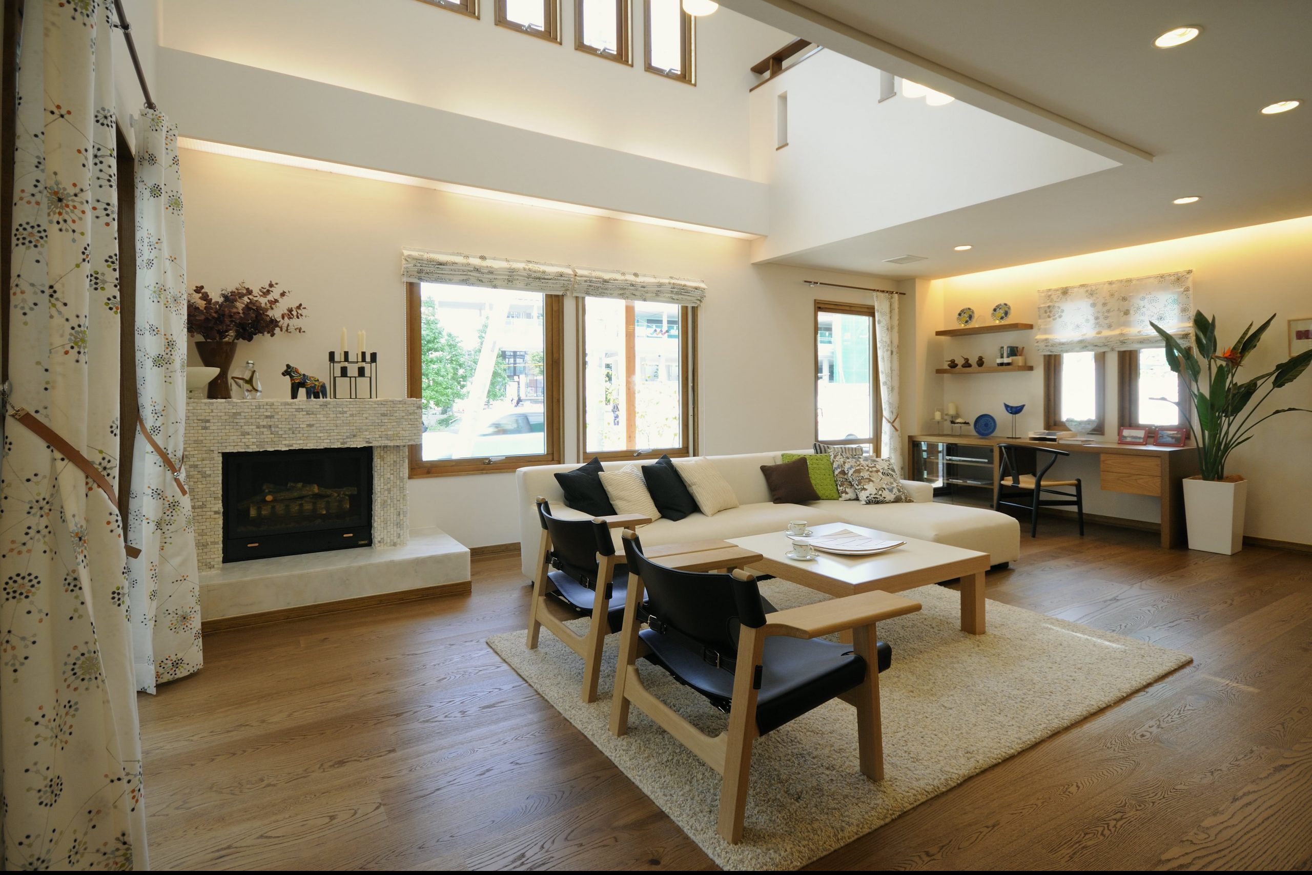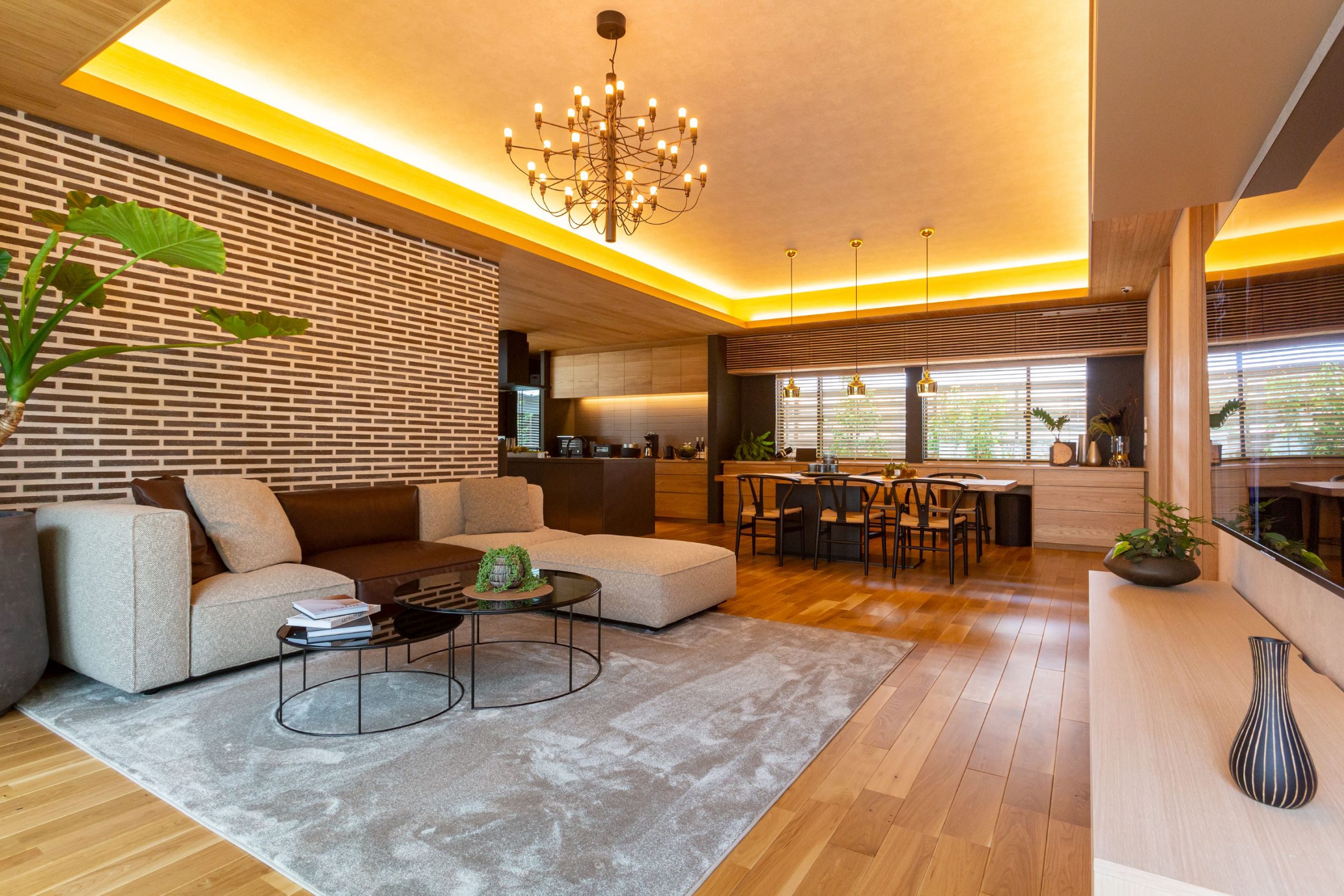 天井高2800㎜の大空間リビング。素材に拘った木材とグレージュインテリアで高級感と温もり感を演出