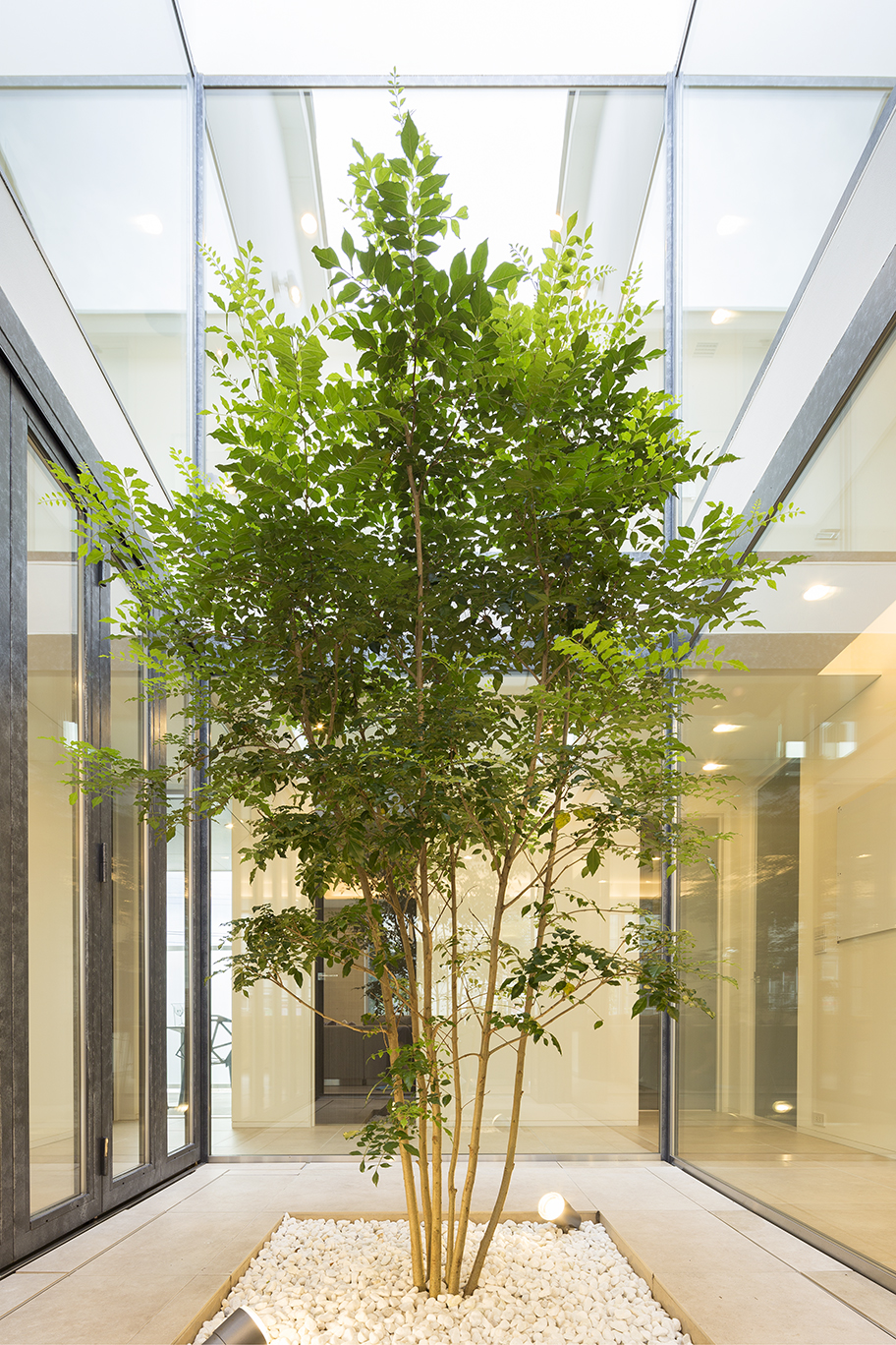 ガラス張りの中庭は、『光の筒』として明るい空間を演出。狭さも感じさせないひと工夫。