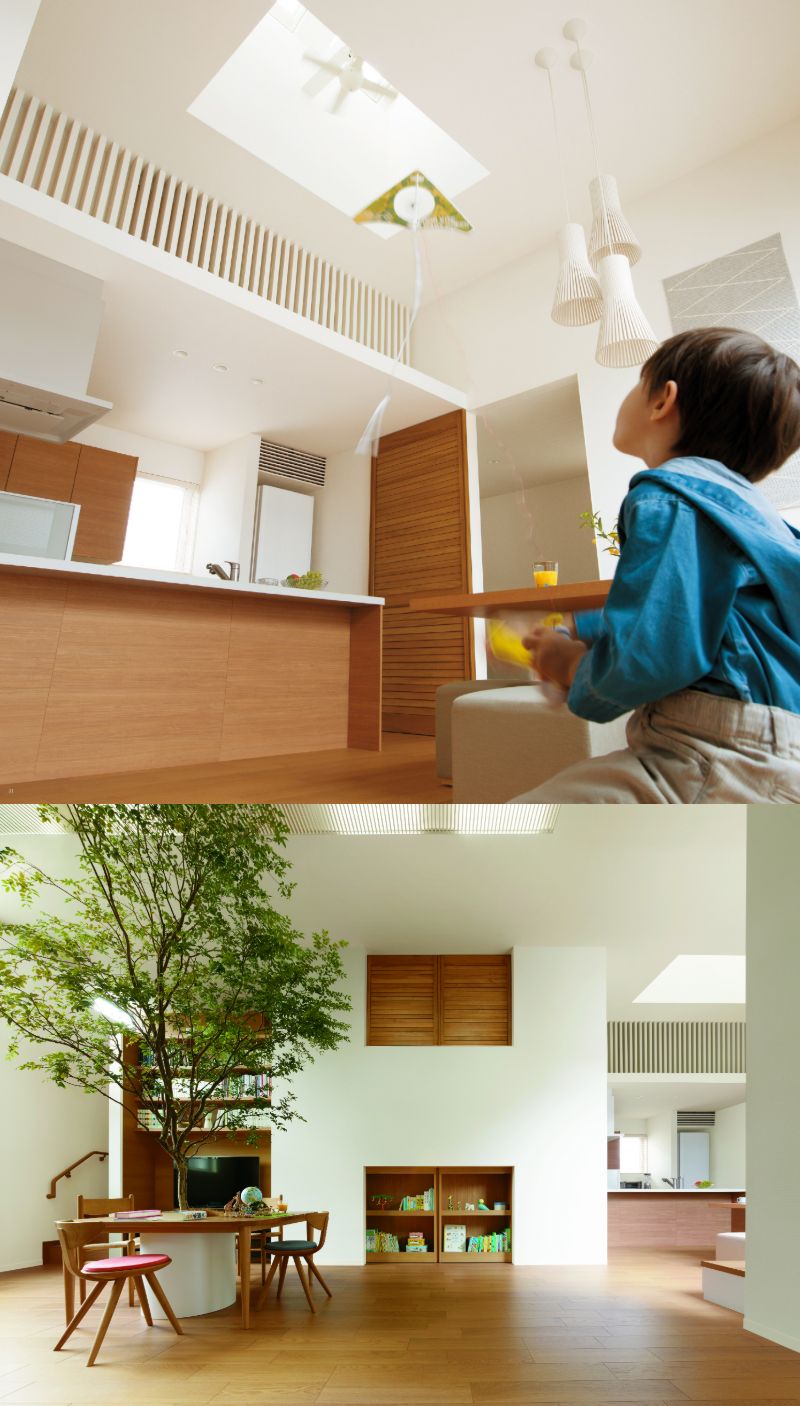 子世帯は木の温もりを感じる明るい空間。3.5m高天井&スキップフロアは子供の空間的知能を刺激します。