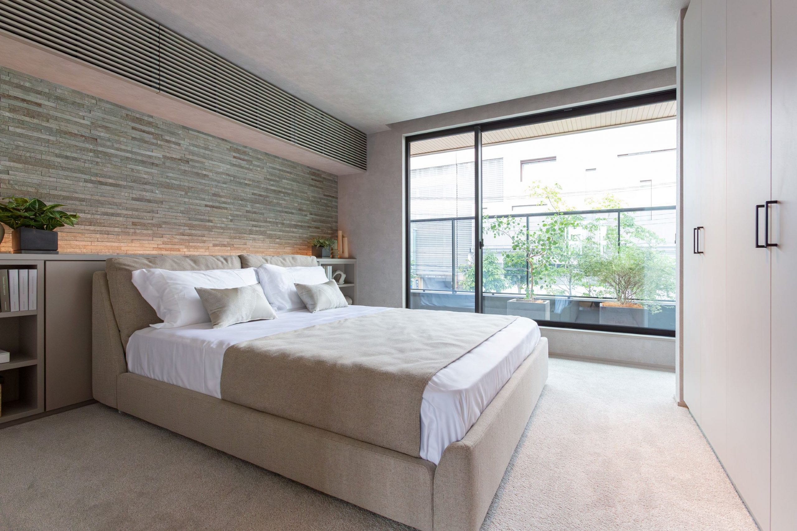 カーペット敷きのグレージュテイストの寝室はゴージャスで落ち着きのある癒し空間