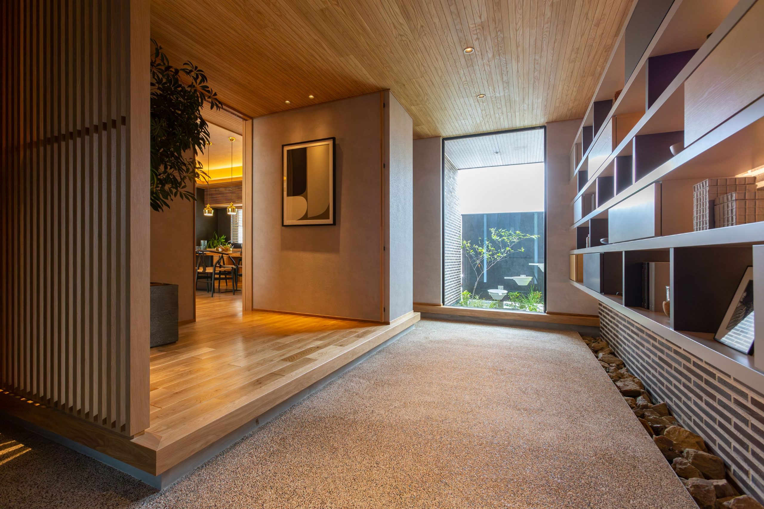 洗い出しを採用した広々とした土間の先に坪庭を眺める贅沢なサプライズエントランス