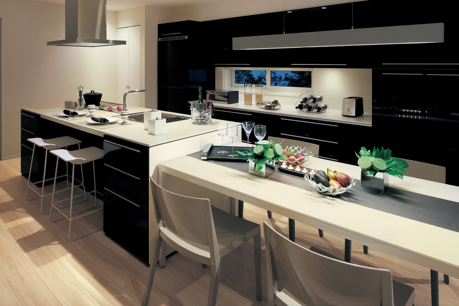 ブラックのキッチンが室内にクールな印象をプラス。家電まで仕舞える豊富な収納スペースを備えています。