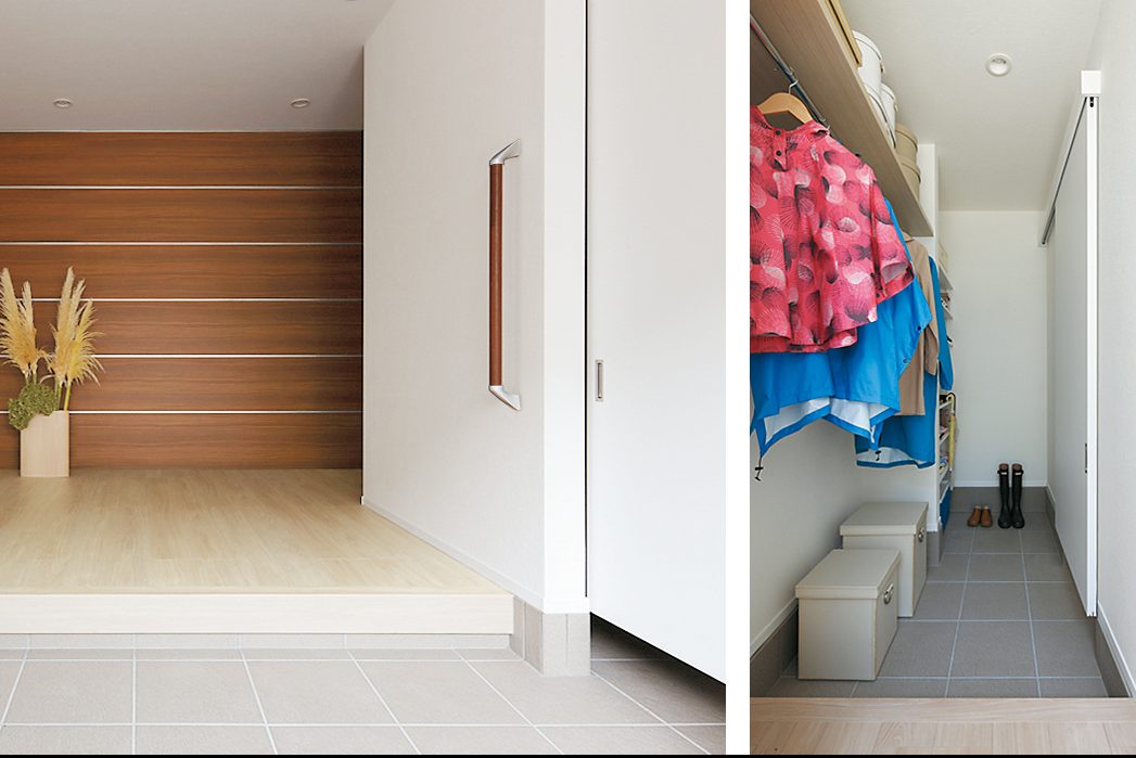 シューズクロークを設けて、玄関をいつでも片付いた状態に。コートなどの上着やバッグも入れられます。